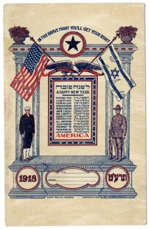 A century ago, Rosh Hashanah in 1918 for Jews in the United States was different than any prior ones during the First World War. Until April 1917, American Jews had only been involved in the war as onlookers who worried about their fellow Jews suffering in the midst of the war in Eastern Europe. American Jewry offered them aid, sustenance, and prayer. The entry of the US into World War I changed the equation; now American Jewish soldiers were fighting on the battlefields of Europe. That reality is reflected in this Rosh Hashanah greeting card for the first Rosh Hashanah American Jews were directly involved in the War. The text, in Yiddish and English, wishes the soldiers a safe and victorious return home to America. The postcard was designed by M. [Mendel] Bennoon, an artist in Chicago, IL. Bennoon was born in Grodno, Belarus, in 1879 and died in Chicago in 1952. The postcard was sent as a New Year greeting for the Jewish year 5679 by friends and relatives to one another and to American Jewish soldiers offering the hope of a year of American victory, “liberty, equality, and fraternity of all nations,” and for the soldiers to return home be-shalom, in safety and in peace.For more on American Jews and the First World War, see /library/2018/04/23/service-to-god-country-and-their-jewish-brethren-american-jews-and-the-first-world-war/Posted by Shulamith Z. Berger
